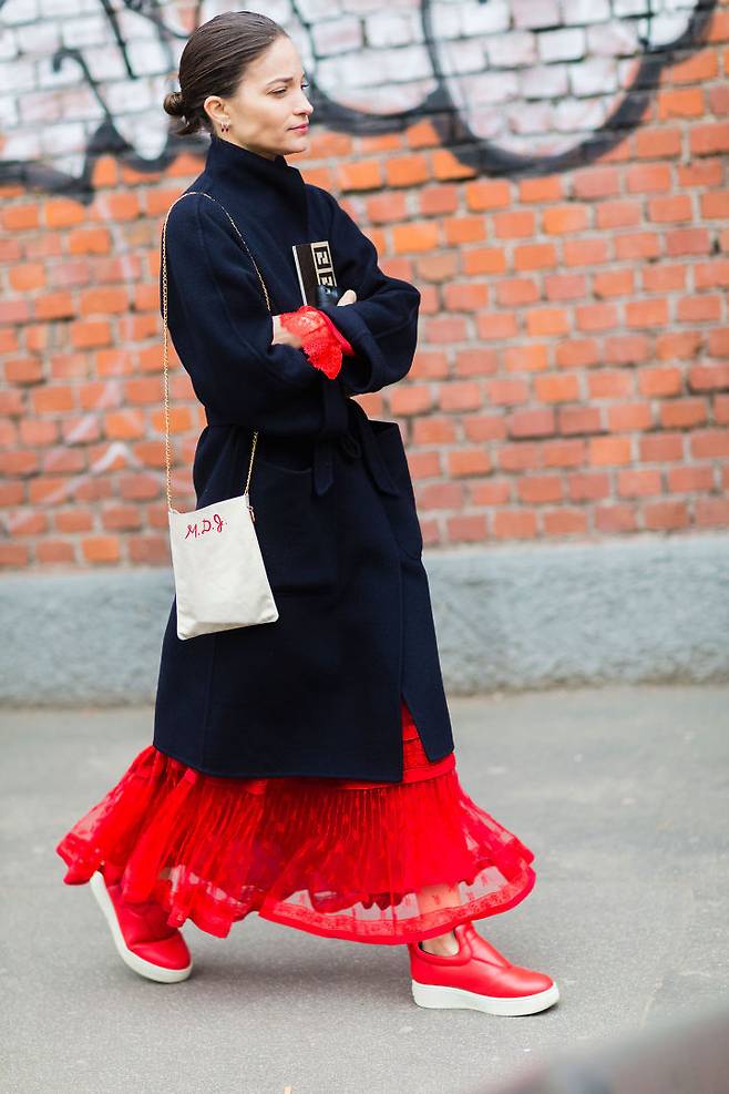 레드컬러를 살짝 얹은 코디부터~