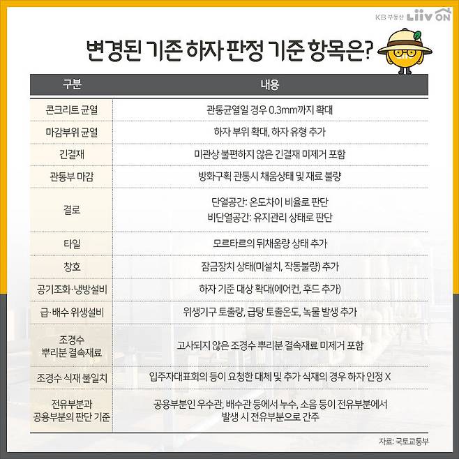 한편 국토교통부 관계자는 “이번 개정안은 그간 축적된 사례를 기반으로 5년 만에 대폭 손질한 내용”이라며 “앞으로 하자로 인한 분쟁을 미연에 방지하고 입주자의 권리를 두텁게 보호하게 될 것”이라고 말하며 기대감을 표했습니다.
