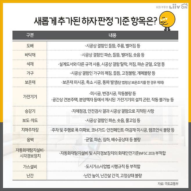 그 중 눈에 띄는 점은 새로 추가된 하자 항목입니다. 도배, 바닥재, 석재, 가구, 보온재, 가전기기, 승강기, 보도·차도, 지하주차장, 옹벽, 자동화재탐지설비·시각경보장치, 가스설비, 난간에 관한 내용이 새로 추가됐습니다.