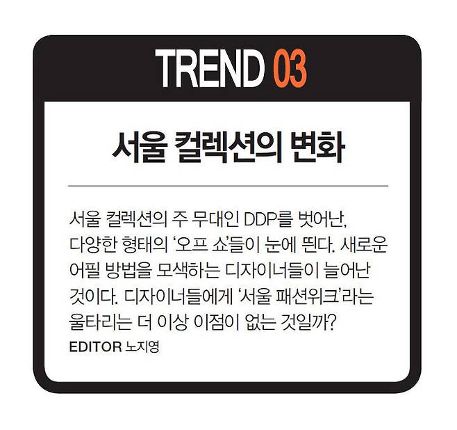 둘째, 서울 패션위크가 주는 실리 대신 SNS 활용 등과 같은 방법으로 고객층과 더 독립적으로 소통하는 방향에 익숙하다. 물론 충성도 높은 고객층을 모은 브랜드가 아니라면 ‘서울 패션위크’ 장외의 쇼는 결코 쉬운 길이 아니다. 그럼에도 이러한 형태의 쇼는 앞으로 더 늘어날 것이다.