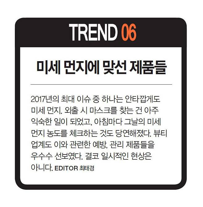 미세 먼지가 어제오늘 일은 아니다. 아모레퍼시픽을 비롯한 국내 브랜드에서는 이미 수년 전에 미세 먼지를 흡착하는 클렌저나 피부에 달라붙는 것을 막아주는 제품을 내놓았기 때문.