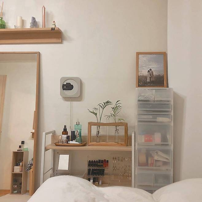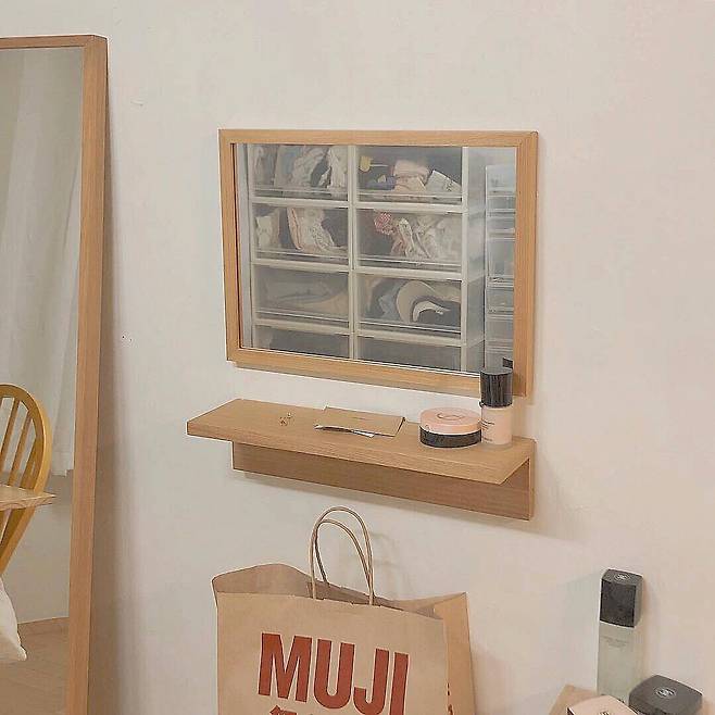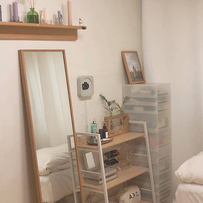 러그 : 바이빔 선데이 러그 / 향초 : 오브젝트 (오프라인) / 의자 : 내츄럴모노 윈저 의자 / 전신거울 : 무인양품 목제거울 / 탁상스탠드 : 루무드 3D달조명 / 책상 : 블루밍홈 원목책상A 800 / 선반 : 무인양품 벽걸이 가구 선반 / 수납함 : 무인양품 PP 수납 케이스 / 수납장 : 무인양품 수납 선반 2단, 3단 / 매트리스 : 무인양품 본넬코일 매트리스 / 책장 : 채우리 쿠키앤크림 밀크화이트 3단 책장 / 침구 : 무인양품 요이불 커버 · 베개 커버 라이트 베이지 / 플로어스탠드 : 무인양품 LED 높이조절 플로어 스탠드
