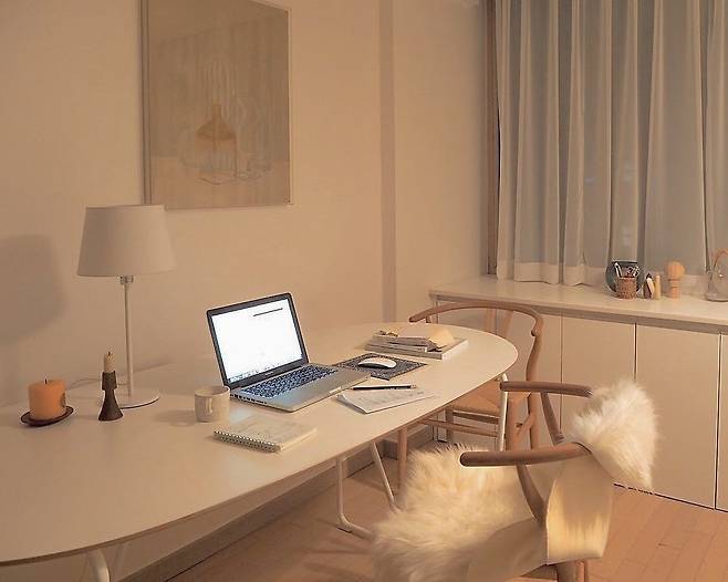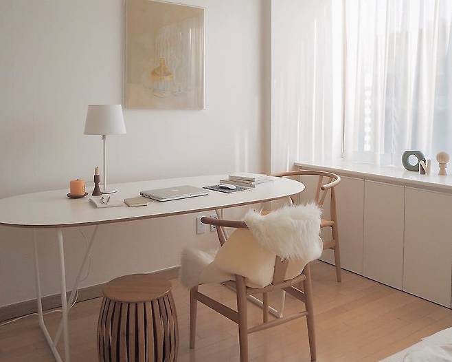 ‘이사하면 꼭 큰 테이블을 놓아야지!’라고 마음먹고 6인용 테이블을 질렀어요. 덕분에 집은 꽉 차지만 테이블 위는 굉장히 넓어서 일하기도 좋고 음식을 차려서 먹기도 너무 좋아서 아주 만족 중이에요! 테이블 위에서 찍은 사진들은 #에이미테이블 로 업로드 하고있구요. :)