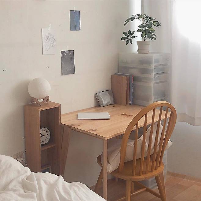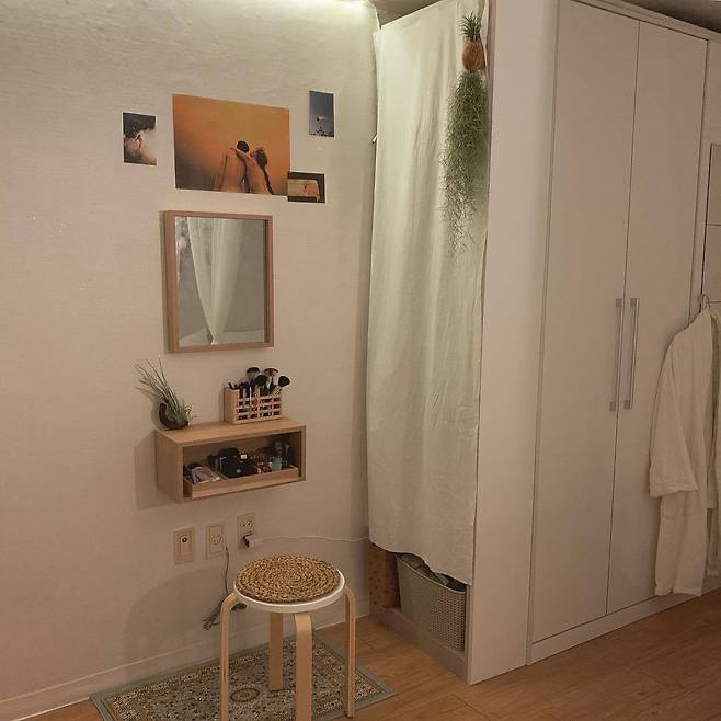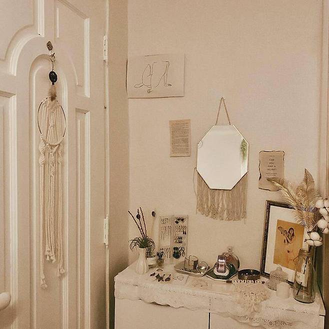 마크라메 : 디피터팻 공방 / 커튼 : 이케아 LILL 릴 망사커튼 한쌍 / 스툴 : 이케아 FROSTA 프로스타 스툴 / 스피커 : 빌보드 레트로 올인원 RT-02 / 무드등 : 네이버 diy 아크릴무드등 검색 / 블라인드 : 창안애 내츄럴 콤비블라인드 / 러그 : 누비지오 페르시안 카페트 아르잔 / 협탁 : 먼데이하우스 A사이드테이블 우드 / 테이블 : 리샘가구 원목좌탁테이블 1200 / 화장대 : 룸앤홈 모리스 벽거울ㆍ수납선반 / 매트리스 : 에코라인 Cl라텍스 매트리스 패드 / 플로어스탠드 : 마켓비 RUSTA 장스탠드 E26 KS1322F / 침구 : 누비지오 팝컬러 화이트 고밀도순면 호텔식침구 매트커버세트