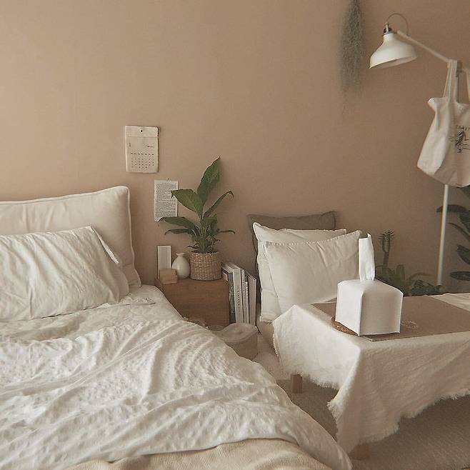 매트리스 : 잉글랜더 / 의자 : 이케아 POÄNG 포엥 암체어 / 사이드테이블 : 모던하우스 (오프라인) / 테이블 : 먼데이하우스 순수원목 H테이블 / 블랭킷 : 이케아 JOFRID 요프리드 스로우 / 작업등 : 이케아 RANARP 라나르프 작업등 / 방석 : 데코뷰 내츄럴 베이지린넨 빵빵이 대방석 / 휴지케이스 : 데코토닉 플레인레더 미니 티슈커버 / 쿠션커버 : 이케아 JOFRID 요프리드, GURLI 쿠션커버 / 플로어스탠드 : 이케아 RANARP 라나르프 플로어스탠드 / 커튼 : 스텝인사이드 린넨 빈티지 펀칭 커튼 다이아 크로셰 태슬 / 침구 : 이케아 OFELIA VASS 오펠리아 바스 이불커버+베개커버2