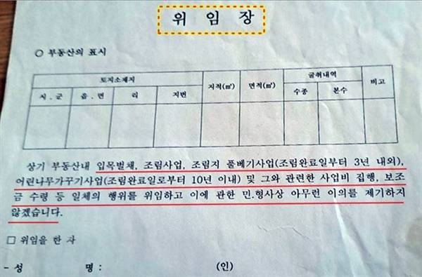 위임장에서 보듯 산주의 역할은 아무것도 없다. 산을 내어주고 그저 1ha에 100만 원을 받는 게 전부다. 벌목부터 조림과 가꾸기 작업, 여기에 국가로부터 받는 모든 예산을 산림조합이 알아서 한다.