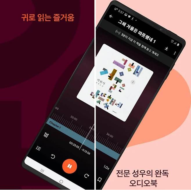 오디오북을 이용해보고 싶은데 높은 구독료가 부담된다면, 비교적 저렴하게 이용할 수 있는 오디오북 앱도 있다. 바로 ‘오디언’이 그것이다. 바쁜 일상 속에서 오디오북을 청취하는 사용자들을 위해 배속 재생 기능을 갖춰 최대 2배속으로 작품을 들을 수 있으며, 작품 내 특정 위치를 북마크해 좋아하는 글귀나 문장을 쉽고 빠르게 찾아 들을 수도 있다. 전문 성우의 목소리로 빠르게 책을 읽고 싶을 때, 특히 유용하겠다.