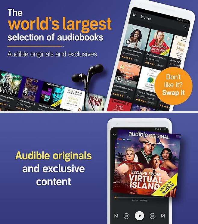 전 세계에서 오디오 콘텐츠를 가장 많이 보유하고 있는 앱은 ‘Audible’이다. Audible은 글로벌 전자 상거래 플랫폼 아마존(Amazon)의 자회사에서 운영하는 오디오북 앱으로, 20만 권 이상의 오디오 콘텐츠를 제공한다. 월 구독료는 14.95달러(약 1만 8000원)로 다른 오디오북 앱에 비해 조금 비싸지만, 첫 번째 도서가 무료로 제공되고, 첫 달은 무료로 서비스를 이용할 수 있어 향후에도 그만한 금액을 투자할 가치가 있는지 충분히 판단할 수 있다.