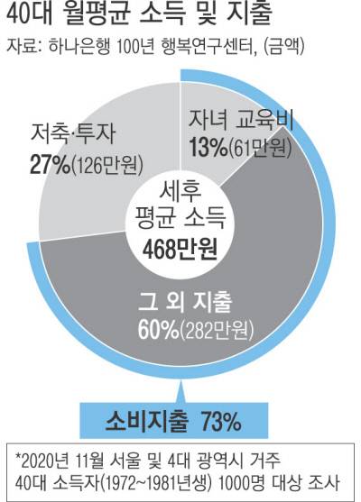 하나은행 100년 행복연구센터가 3일 내놓은 ‘대한민국 40대가 사는 법’ 보고서에 따르면 설문조사에 응한 서울 및 4대 광역시에 거주하는 40대(1972~1981년생) 소득자 1000명의 평균 세후소득은 월 468만원으로 집계됐다. 지출은 소득의 73%인 343만원으로 자녀교육비가 61만원(13%), 그 외 지출이 282만원(60%)이었다. 저축과 투자에 쓴 돈은 126만원(27%)이었다.