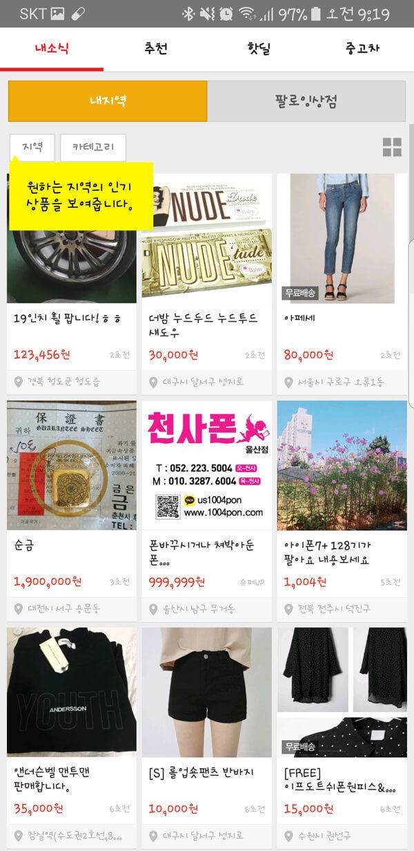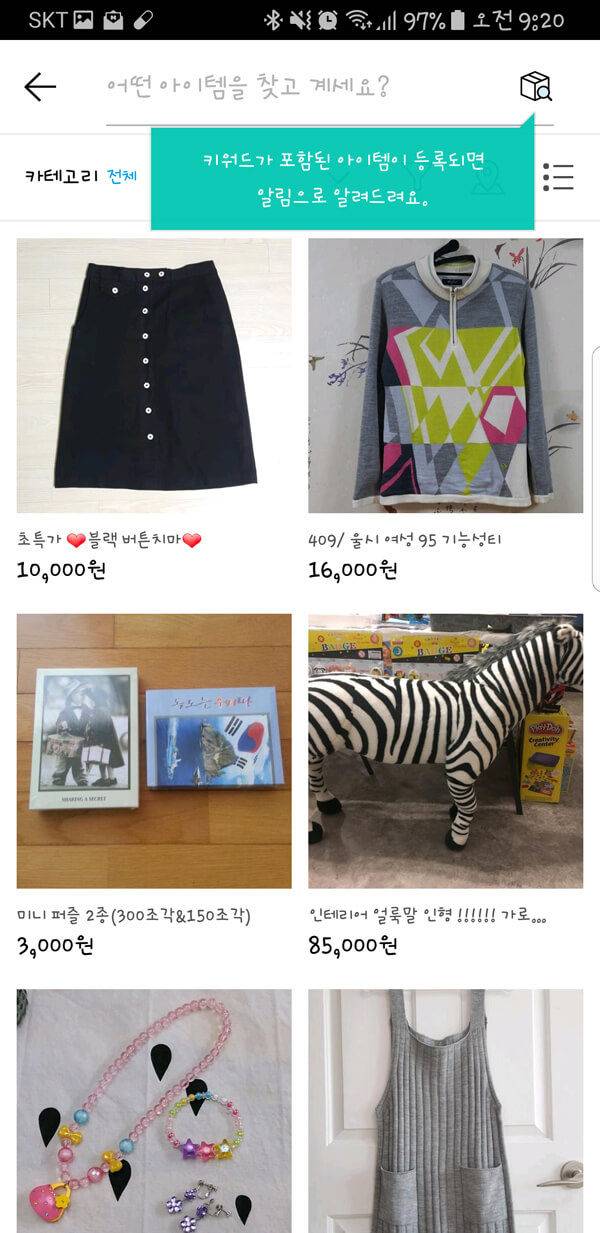사용자가 거주하는 지역을 검색하거나 특정 상품 검색을 통해 편리하고 안전한 중고 거래 기반을 제공하고 있다. 또한 판매자 및 구매자와 앱을 통해서 대화를 나눌 수 있기 때문에 빠른 거래가 가능하다는 특징을 가지고 있다.