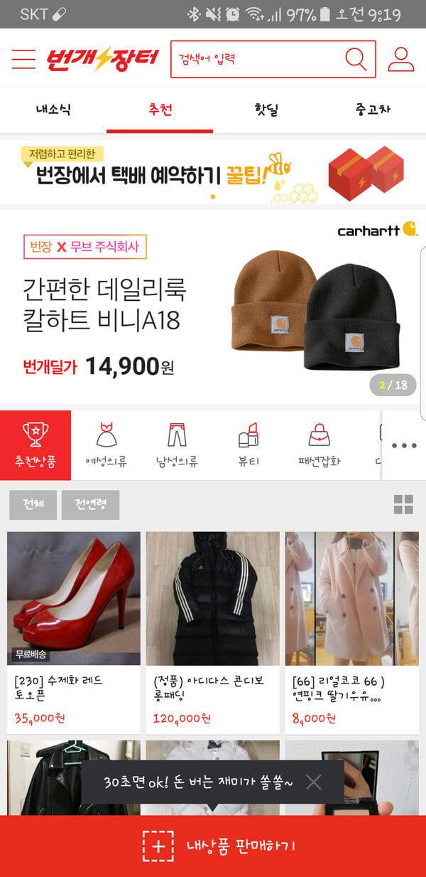 누적 사용자 수가 1000만 명을 돌파할 정도로 큰 인기를 얻고 있는 번개장터다. 휴대폰 번호나 SNS 계정을 활용하여 3초 만에 로그인이 가능하다는 장점을 가지고 있다. 본인의 물건을 판매하고자 할 경우에는 스마트폰으로 촬영 후 설명만 적으면 간단하게 등록할 수 있기 때문에 초보자도 손쉬운 사용이 가능하다는 장점을 가지고 있다. 또한 검색 최적화 필터를 적용하여 원하고자 하는 물품을 손쉽게 찾을 수 있다.