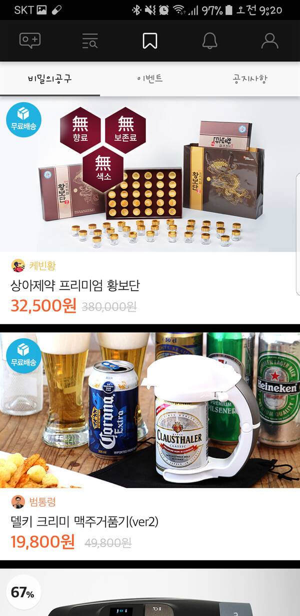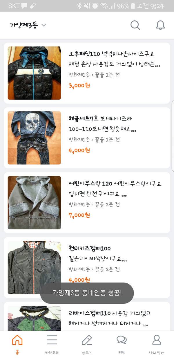 거주하는 지역을 기반으로 하여 이웃들과 다양한 중고 상품을 거래할 수 있는 서비스를 제공하는 당근마켓 앱이다. 실제 내가 사는 지역을 인증하는 시스템을 적용하여 안전성을 높여주며, 사용자의 매너 온도를 통해 실제 거래 매너를 제공하는 장점을 가지고 있다. 전문 중고 판매자가 없는 클린 마켓을 유지하고 있는 점도 이채롭다.