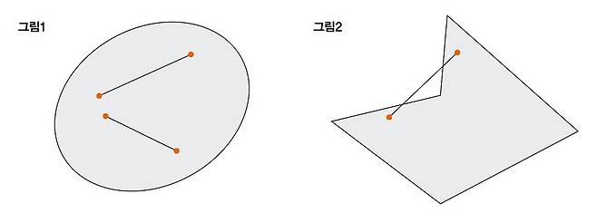 [그림1]에서 도형에 포함되는 두 점을 아무렇게나(임의로) 잡아 선분을 만든다. 그 선분이 도형에 온전히 포함되면 볼록하다(convex)고 정의한다. [그림2]처럼 두 점을 잇는 선분이 일부라도 도형 밖으로 나가면 볼록한 도형이 아니다. 이처럼 수학 용어는 ○×를 확실하게 판단할 수 있도록 정의한다. 즉, 언어의 경계가 명확하다는 이야기다.