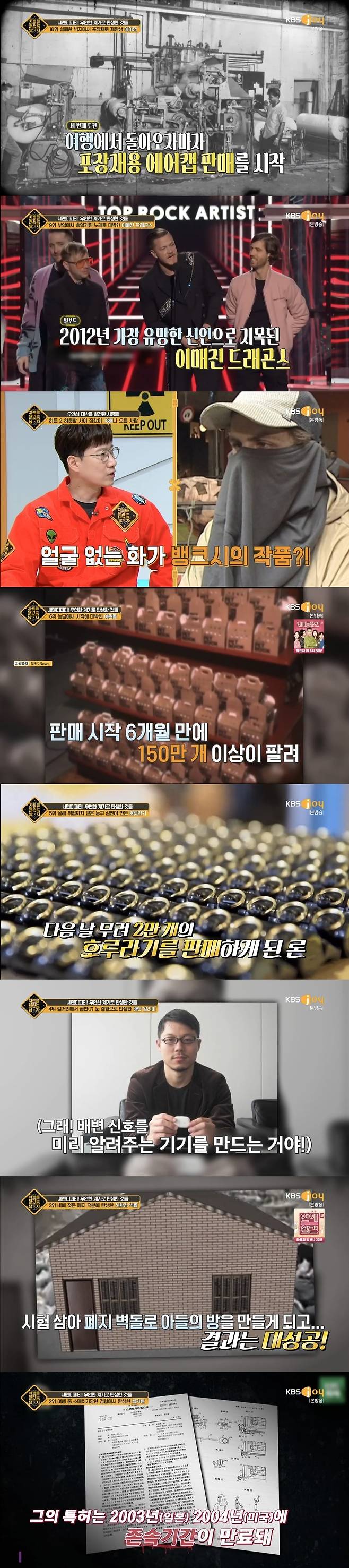 10위는 에어캡 탄생 과정이었다. 부드럽고 투명한 플라스틱에 공기가 들어 있는 에어캡은 일명 뽁뽁이로 불리기도 한다. 주로 깨지기 쉬운 물건을 보호하는 포장재로 사용되는데 매년 지구를 두 번 감을 정도로 널리 쓰이는 에어캡은 실패한 벽지에서 탄생했다고. 에어캡 벽지는 아쉽게도 미관상 좋지 않아 상용화될 수 없었다. 그러다 포장재용으로 에어캡을 판매하기 시작했고, 1970년대부터 전 세계적인 히트 상품으로 떠올랐다.