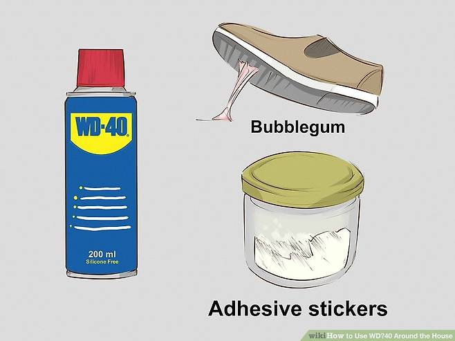 WD-40은 끈적끈적한 접착제를 표면에서 분리하는 최고의 청소 용품이다. 껌, 라벨이나 마스킹 테이프, 접착제 잔여물 등을 제거할 수 있다. 액체를 분사하고, 마른 천이나 브러시, 안 쓰는 칫솔로 문지르면 된다.