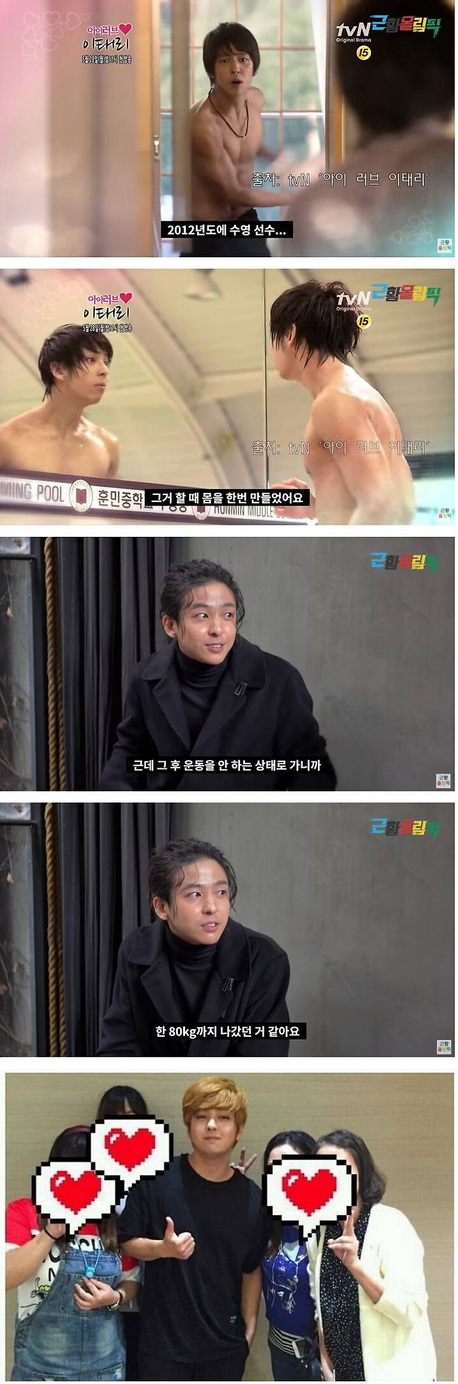 그 사진도 중국에서 찍혔죠. 2016년도인가? 저는 원래 살이 찌는 체질이 아니었어요. 어렸을 때 갈비뼈로 기타 치고 그랬는데 2012년도에 '아이 러브 이태리'라는 판타지 드라마에서 갑자기 몸이 커버린 수영 선수 역할을 맡으면서 몸을 한번 만들었어요. 근데 그 후 운동을 안 하는 상태로 가니까 불과 한 두 달 사이에 이렇게 막 되더니 몸무게 70kg를 처음 넘었어요. 그때는 한 번 쪄보고 싶었어요 뭐가 달라지는지. 한 80kg까지 나갔던 것 같아요.
