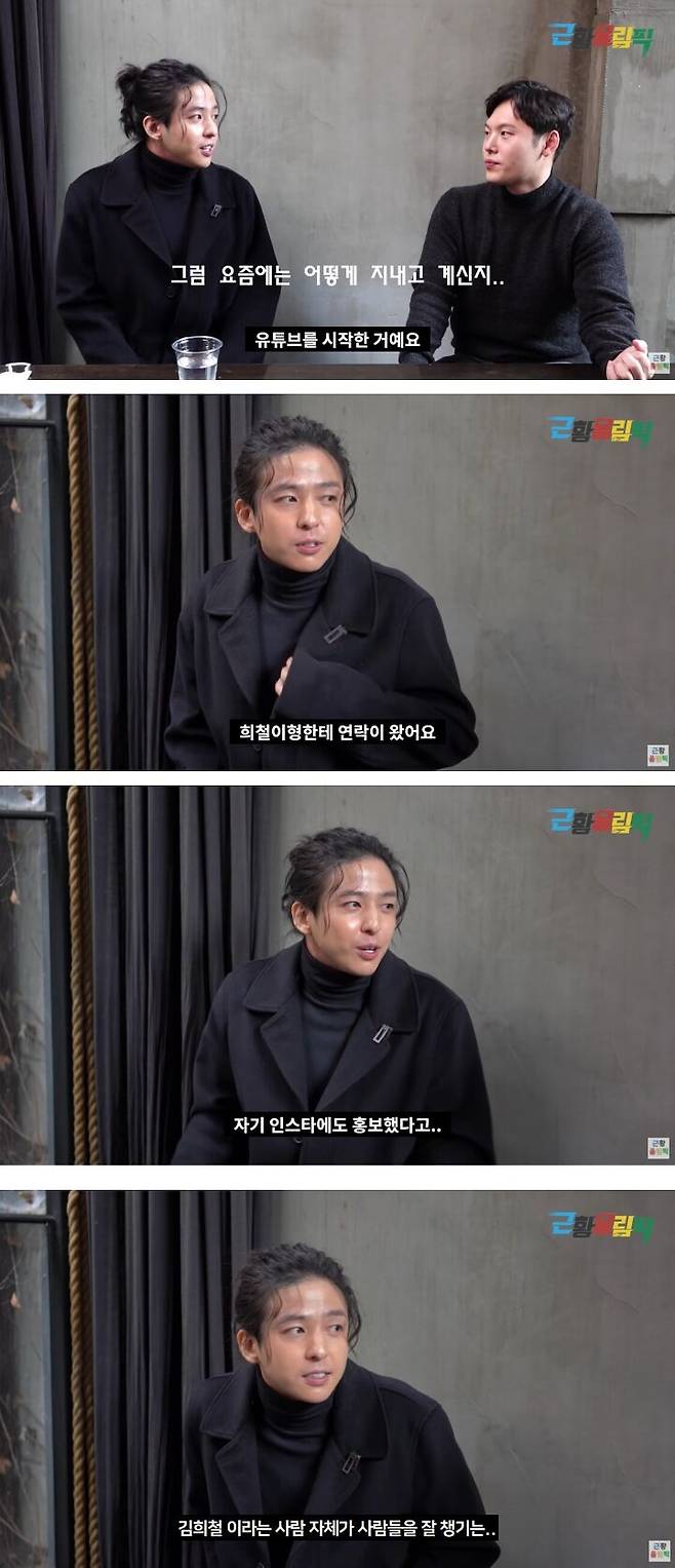 최근에 큰 사건은 유튜브를 시작한 거예요. 희철이 형한테 연락이 왔어요. '이름 영어로 어떻게 쓰냐?' 그러길래 알려줬는데 전혀 다르게 아이디를 만들었더라고요. 'KIM'인데 'GIM'으로 하고.. 자기가 다 만들어서 사진도 그 형이 고른 거고 '2분, 3분 정도 인사 영상 찍어라' 해서 밖에 걷고 있을 때 그거 찍고 그냥 보낸 거예요 (첫 영상). 자기 인스타에도 홍보했다고 하고 이렇게까지 해주는데 이건 내가 좀 해봐야겠다 라는 생각이 들었어요. 영상 다 형이 올린 거예요. 김희철이라는 사람 자체가 사람들을 잘 챙겨요.