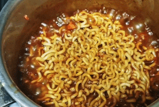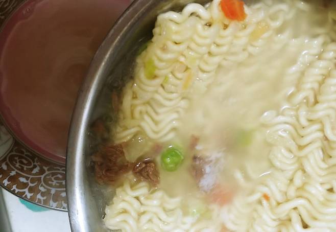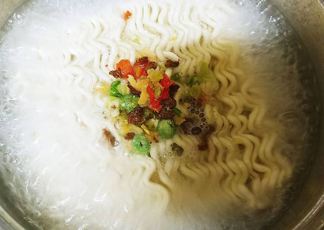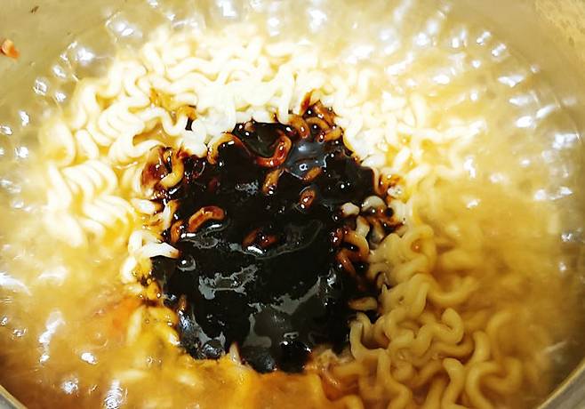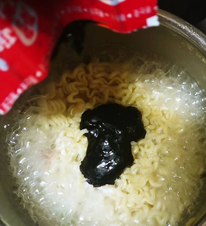 냄비 속에서 보글보글 끓는 모습.. 약간 빨간 색상이지 않을까 싶었으나 영락없는 짜장라면의 색!!