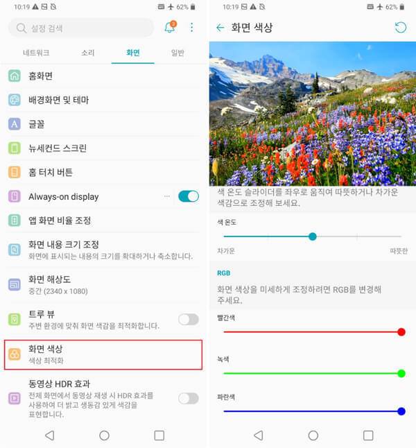 이어 LG전자 스마트폰의 경우 [설정]-[화면]-[화면 색상] 하단에서 RGB를 조절할 수 있다. 이때 컨트롤바를 움직이면 화면 상단에 표시된 이미지의 색감이 조금씩 변하는 것을 볼 수 있는데, 각자 자신에게 알맞은 정도로 색감을 조절해주면 되겠다.