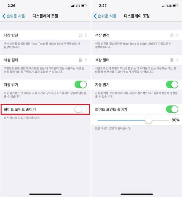 마지막으로 아이폰의 경우 [설정]-[일반]-[손쉬운 사용]-[디스플레이 조절]을 이용하면 눈의 피로도를 조금이나마 줄일 수 있다. 다만 안드로이드 스마트폰처럼 RGB를 조절할 수는 없고, 밝은 색상의 강도를 전체적으로 줄이는 것만 가능하다.