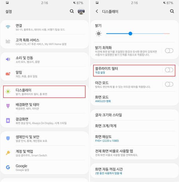 블루라이트 차단 필터를 활성화하는 것 이외에도 수동으로 눈의 피로도를 줄이는 방법이 있다. 우선 삼성전자 스마트폰의 경우 [설정]-[디스플레이]-[화면 모드]에서 화면 최적화를 통해 디스플레이의 색감을 조절할 수 있는데, 이곳에서 RGB의 강도를 줄여 눈의 피로도를 낮출 수 있다.