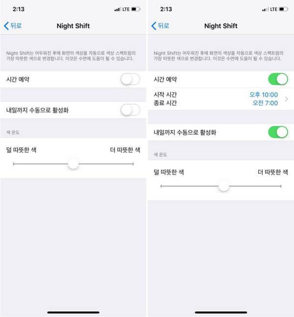 또한 시작시간과 종료시간을 설정하면 특정 시간대에만 블루라이트 차단 필터를 사용할 수 있으며, 하단의 컨트롤바를 이용해 필터의 강도를 자유롭게 조절할 수 있다. 이때 색 온도가 '더 따뜻한 색'에 가까워질수록 필터의 강도가 강해지며, 화면이 더 누렇게 보인다.