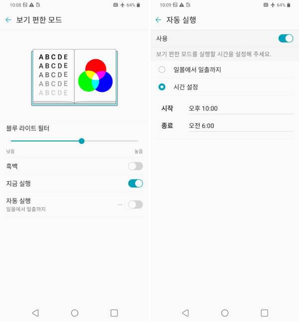 LG전자의 스마트폰(안드로이드 9.0 파이)에서 블루라이트 필터를 켜는 방법도 비슷하다. [설정] 앱의 우측 상단에서 [화면] 탭을 누른 다음 [보기 편한 모드]를 선택하면 블루라이트를 조절해 눈의 피로도를 줄일 수 있다.