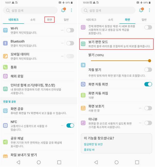 LG전자의 스마트폰(안드로이드 9.0 파이)에서 블루라이트 필터를 켜는 방법도 비슷하다. [설정] 앱의 우측 상단에서 [화면] 탭을 누른 다음 [보기 편한 모드]를 선택하면 블루라이트를 조절해 눈의 피로도를 줄일 수 있다.