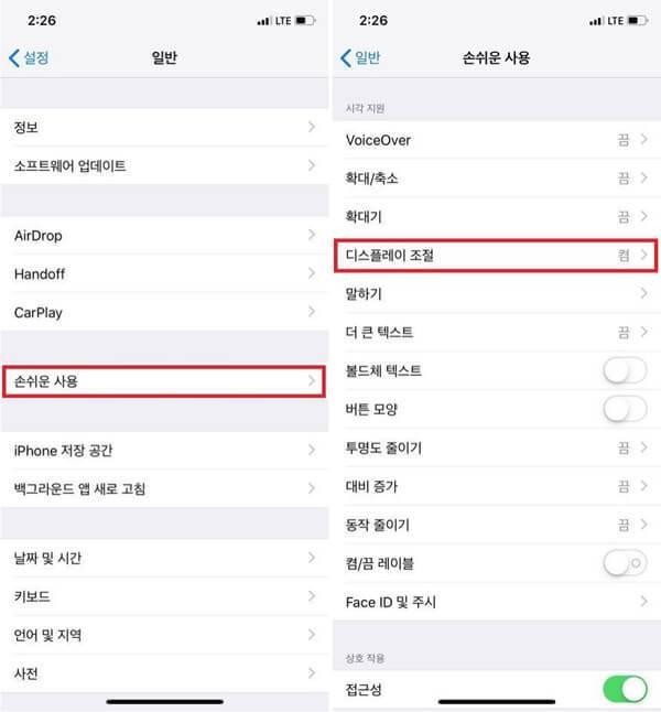 마지막으로 아이폰의 경우 [설정]-[일반]-[손쉬운 사용]-[디스플레이 조절]을 이용하면 눈의 피로도를 조금이나마 줄일 수 있다. 다만 안드로이드 스마트폰처럼 RGB를 조절할 수는 없고, 밝은 색상의 강도를 전체적으로 줄이는 것만 가능하다.