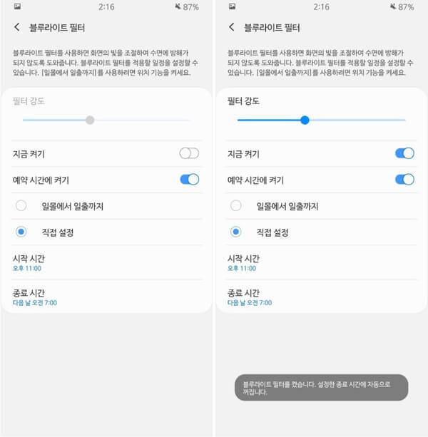 또한 시작시간과 종료시간을 설정하면 특정 시간대에만 블루라이트 차단 필터를 사용할 수 있으며, 하단의 컨트롤바를 이용해 필터의 강도를 자유롭게 조절할 수 있다. 이때 색 온도가 '더 따뜻한 색'에 가까워질수록 필터의 강도가 강해지며, 화면이 더 누렇게 보인다.