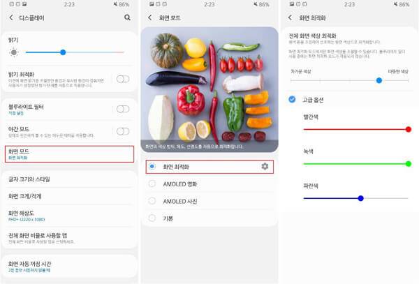 블루라이트 차단 필터를 활성화하는 것 이외에도 수동으로 눈의 피로도를 줄이는 방법이 있다. 우선 삼성전자 스마트폰의 경우 [설정]-[디스플레이]-[화면 모드]에서 화면 최적화를 통해 디스플레이의 색감을 조절할 수 있는데, 이곳에서 RGB의 강도를 줄여 눈의 피로도를 낮출 수 있다.