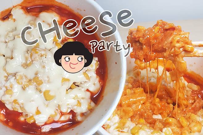 그리고 그 위에 콘치즈 그라탕의 모든 재료를 넣고 치즈가 잘 녹도록 전자레인지에 1분 30초 돌려주세요!