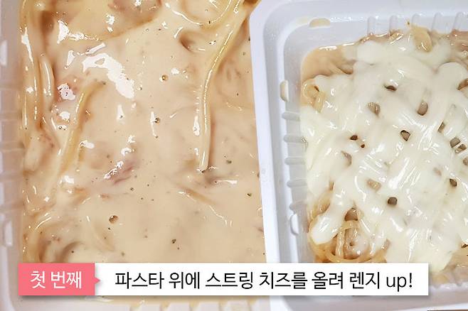 파스타를 기본 용기에서 조리한 후 스트링치즈를 얹어 전자레인지에서 30초가량 돌려주세요. 그리고 나초를 부서서 뿌려주면, 5,200원에 초간단 나초 파스타 완성!