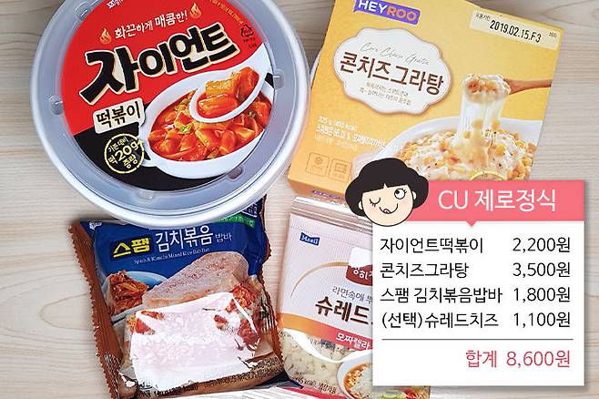 그다음 레시피를 알아볼까요? CU제로정식으로 그야말로 신상 꿀 조합이에요. 모든 재료는 CU에서 만날 수 있죠. 재료 중 슈레드 치즈는 콘치즈 그라탕에도 소량 들어 있기 때문에 생략하셔도 괜찮아요.