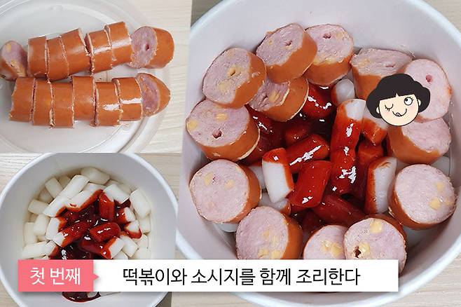 우선 자이언트 떡볶이 조리 먼저 시작해요. 떡볶이를 열어 소스를 넣은 후 그 뚜껑을 이용해 소시지를 썰어서 넣어주세요.