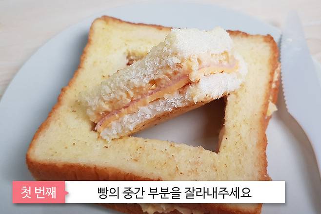 우선 토스트의 중간 부분을 가능한 크게 잘라내 주세요. 이곳에 파스타를 담을 것이기 때문이죠 ㅎㅎ