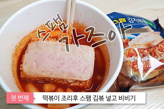 여기도 자이언트 떡볶이가 베이스인데요. 떡볶이를 먼저 조리한 후 스팸 김치볶음밥을 넣어 비벼줍니다. 이때 수저를 이용해 위의 스팸을 잘게 조각내주세요