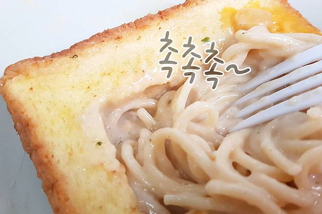 토스트에 촉촉하게 베어든 크림소스의 조화가 의외로 괜찮았어요! 여기에 토스트의 버터 향과 햄의 짭조름함이 어우러지니 베이컨을 넣은 까르보나라 맛이랄까? 하지만 크림소스가 적은 편이라 빠네의 맛을 느끼기엔 살짝 부족한 부분이 있어요.