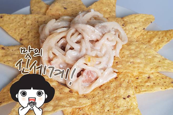 또는 접시 위에 나초를 올린 후 파스타를 얹어주는 방법도 있어요. 사실 맛이 제일 궁하시죠? 크림 파스타와 나초의 조화는 의외로 꿀 조합이었어요. 나초 특유의 향과 짭조름함이 크림 파스타의 맛에 재미를 주는데요. 마치 크림수프에 크루통을 올려먹는 느낌 같아요.