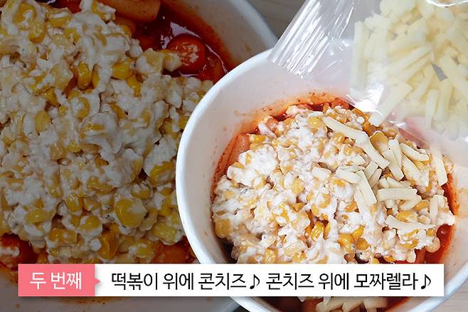 그리고 그 위에 콘치즈 그라탕의 모든 재료를 넣고 치즈가 잘 녹도록 전자레인지에 1분 30초 돌려주세요!