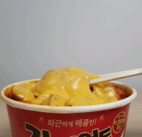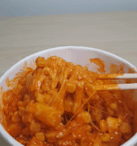 그러면 치즈와 매콤한 떡볶이의 꿀 비주얼이 만들어져요! 두재료의 팀 플레이가 아주 적절한데요. 매우려고 하면 콘치즈의 달콤함과 고소함이 올라와 매운맛을 잠재워줘요. 그리고 아래에 있는 스팸의 향과 맛이 어우러져 풍미를 더하고 김치볶음밥은 든든함을 더해요. 전체적으로 짠맛이 강하긴 했지만 그래도 만족스러운 레시피였어요.