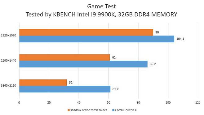 UHD 환경에서도 평균 60프레임 이상을 기록한 포르자 호라이즌 4는 RTX 2070 정도 그래픽카드를 통해 충분한 4K 게이밍 환경을 제공할 수 있었으며, 다소 요구 사양이 높은 쉐도우 오브 더 툼레이더도 울트라 옵션 프리셋이 아닌 보통이나 높은 옵션 프리셋을 적용하면 만족스러운 게임 환경을 제공할 수 있다.