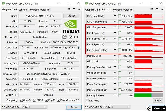 참고로 GPU-Z에서 측정된 Fan2의 RPM은 소프트웨어상 오류인 것으로 판단되며, Fan2의 로드율과 Fan1의 로드율과 RPM을 비교하면 이를 알 수 있다.