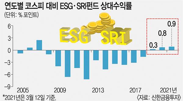 ESG 펀드는 2019년과 지난해에도 코스피보다 각각 0.3% 포인트, 0.8% 포인트 높은 수익률을 기록했다.