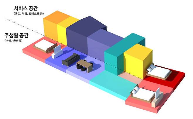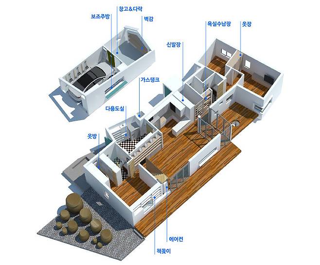 따라서 안채에는 욕실, 부엌, 드레스룸 등 기능적인 켜와 거실, 안방 등 주생활 공간의 켜를 병치하여 서비스 동선을 줄이면서, 겹집효과를 거두어 냉난방비도 줄일 수 있게 하였다.