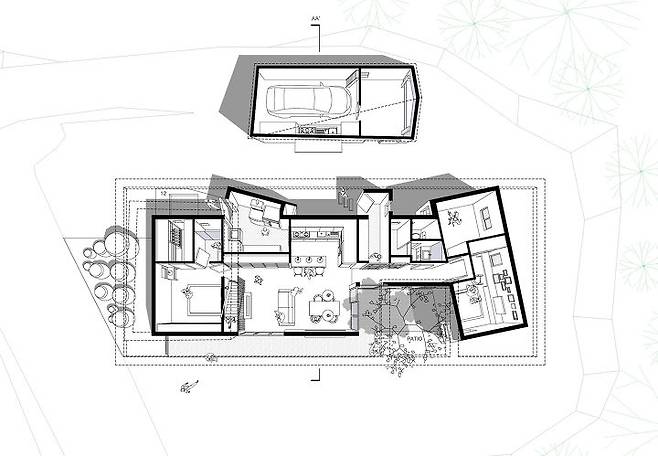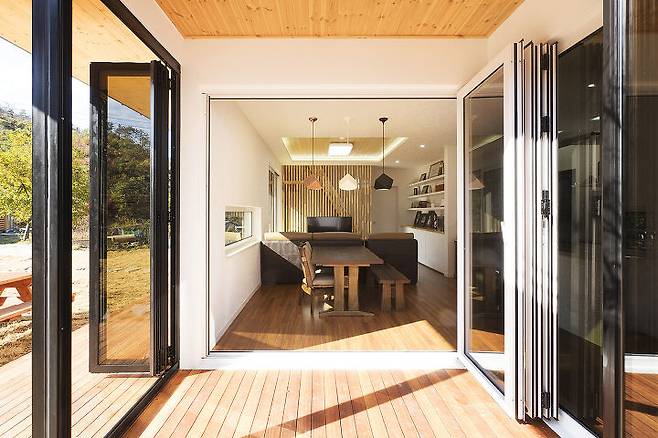 1700㎡가 넘는 대지 위 100㎡의 집. 이는 건축가에게도 하나의 도전이었다. 그래서 실내는 최대한 컴팩트하게 만들되, 시각적 · 기능적으로 외부로 확장가능하게 하여 용도와 계절에 따라 공간을 가변적으로 사용할 수 있도록 하였다.