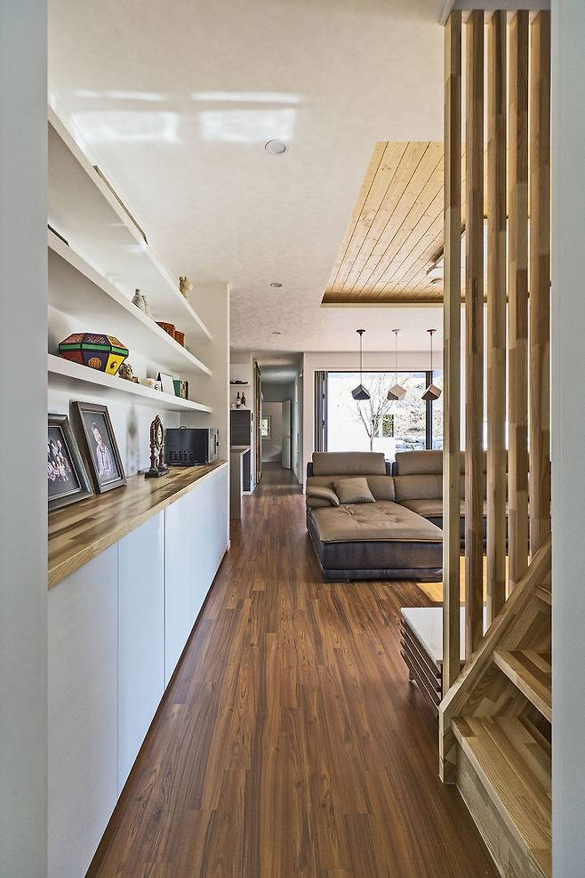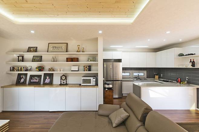 수납공간이 많이 필요한 농가주택 특성을 고려하여 집안 곳곳에 창고와 수납공간을 마련하였다. 특히, 수납공간을 숨기기보다는 드러내어 그 자체로 하나의 풍경이 될 수 있도록 하였다. 덕분에 별다른 장식 없이도 풍부한 인테리어 효과를 거둘 수 있었다.