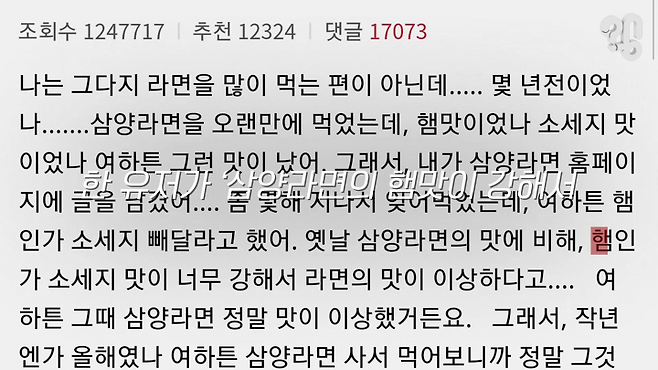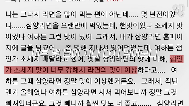 사실 저희가 일부러 뺀 건 아니고 개선하는 과정에서 일부 예전 맛을 좋아하셨던 분들이 ‘맛이 달라졌다’ ‘햄맛이 덜 난다’ 말씀을 하셨던 거 같아요. 햄맛을 원하는 사람들의 요청이 있어서 반영을 한거죠. 디시갤 글을 보고 성지라고 그것 때문에 맛이 변한 건 아니에요.