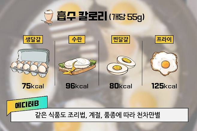 계란 한 알도 어떻게 조리하느냐에 따라 칼로리가 달라집니다. 생달걀은 75kcal이고, 조리법에 따라 최대 50kcal까지 차이가 나요. 그뿐만 아니라 조리를 거치지 않은 생달걀끼리도 칼로리는 물론 영양학적으로 차이가 나는데요. 어떤 환경에서 자란 닭이 무엇을 먹고 어떤 계절에 낳았느냐도 영향을 끼치죠. 심지어 얼마나 잘 씹는지에 따라서도 칼로리가 달라집니다. 이는 채소와 곡류, 육류, 생선 등 자연에서 나는 모든 식품에 해당됩니다.