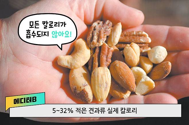 미국 농무부 산하 농업연구소는 아몬드와 호두 등 견과류의 실제 칼로리와 체내 흡수되는 칼로리를 비교했습니다. 체내 흡수되는 칼로리가 라벨에 표시된 것보다 5~32% 적은 것으로 나타났어요. 식품이 가진 영양소와 칼로리가 체내에서 모두 사용되는 것이 아니기 때문입니다. 거기다 견과류에 든 식이섬유를 소화하는 과정에서 생각보다 많은 칼로리가 소모되기도 합니다. 한 번 가공되어 소화할 거리가 적은 가공식품과는 다르죠.